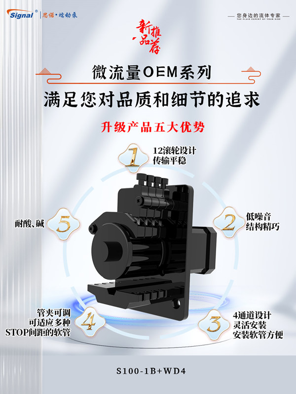 產(chǎn)品有以下特點(diǎn):1. 12滾輪設(shè)計(jì),傳輸平穩(wěn)。微流量OEM系列S100-1B+DD4/XD4/WD4采用12滾輪設(shè)計(jì),使得傳輸過程更加平穩(wěn),穩(wěn)定的傳輸效果。